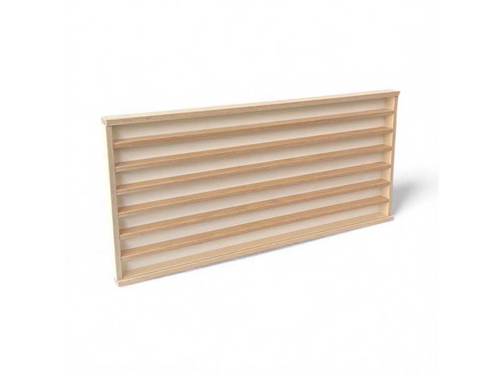 001 VITRINA 90cm x 42,5cm x 5,3cm, 4cm využitelná hloubka, 7 podlaží po 4,6cm vysokých, 1 plexi v jedné drážce
