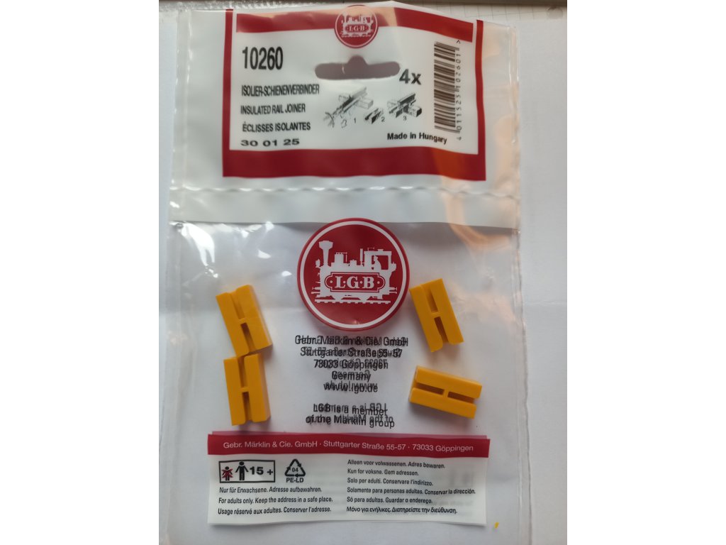 Izolované kolejnicové spojky umožňují stavbu izolovaných úseků kolejí. K tomu je nutné kovové kolejnicové spojky nahradit robustními plastovými kolejnicovými spojkami. Obsah balení: 4 kusy.