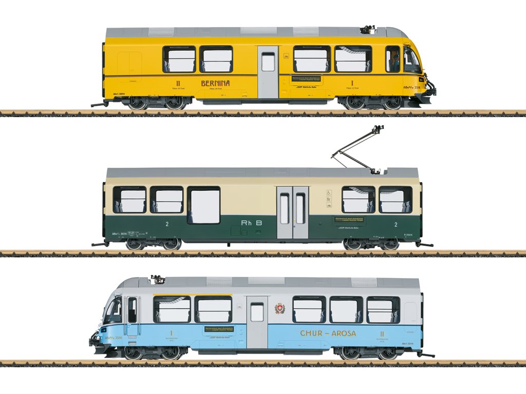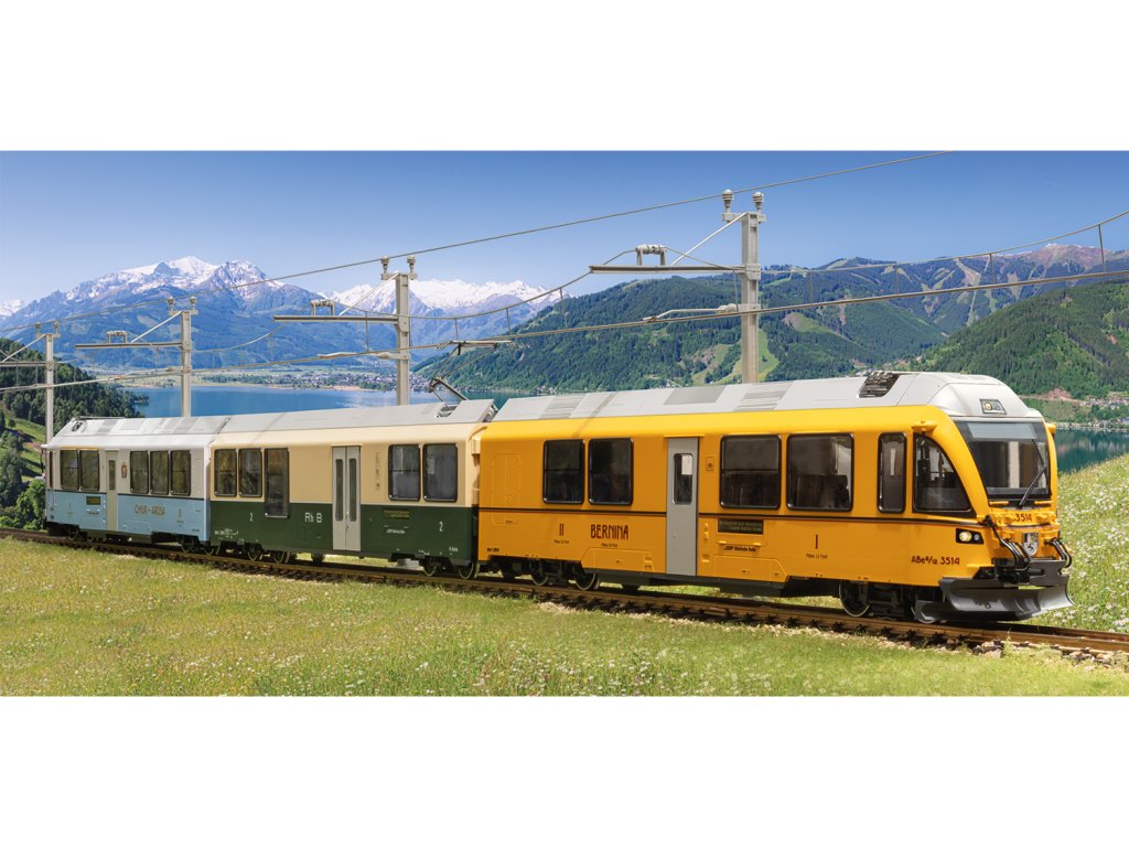 Model motorového vlaku třídy RhB ABe 8/12 "Allegra" číslo 3514. Věrné originální barevné schéma a písmo z éry VI, které představuje dřívější barevné schéma Berninské dráhy, Rhétské dráhy a Arosské dráhy. Poháněn dvěma vysoce výkonnými motory na čtyřech nápravách a trakčními pneumatikami je vybaven dekodérem mfx/DCC s řadou zvukových a světelných funkcí. Pantografy na koncových vozech lze dálkově zvedat a spouštět. Všechny vozy mají kovová dvojkolí a prostřední vůz má dvojkolí s kuličkovými ložisky. Všechny dveře se otevírají. Součástí je mnoho samostatně aplikovaných detailů, jako je elektroinstalace, zásuvky, stěrače čelního skla, antény a zpětné zrcátko. Součástí dodávky jsou pružinové nárazníky a kompletní ochranný kryt kolejnice; střední část ochranného krytu kolejnice lze vyměnit za přiložený spojkový prvek systému LGB. Délka přes nárazníky: 206 cm.