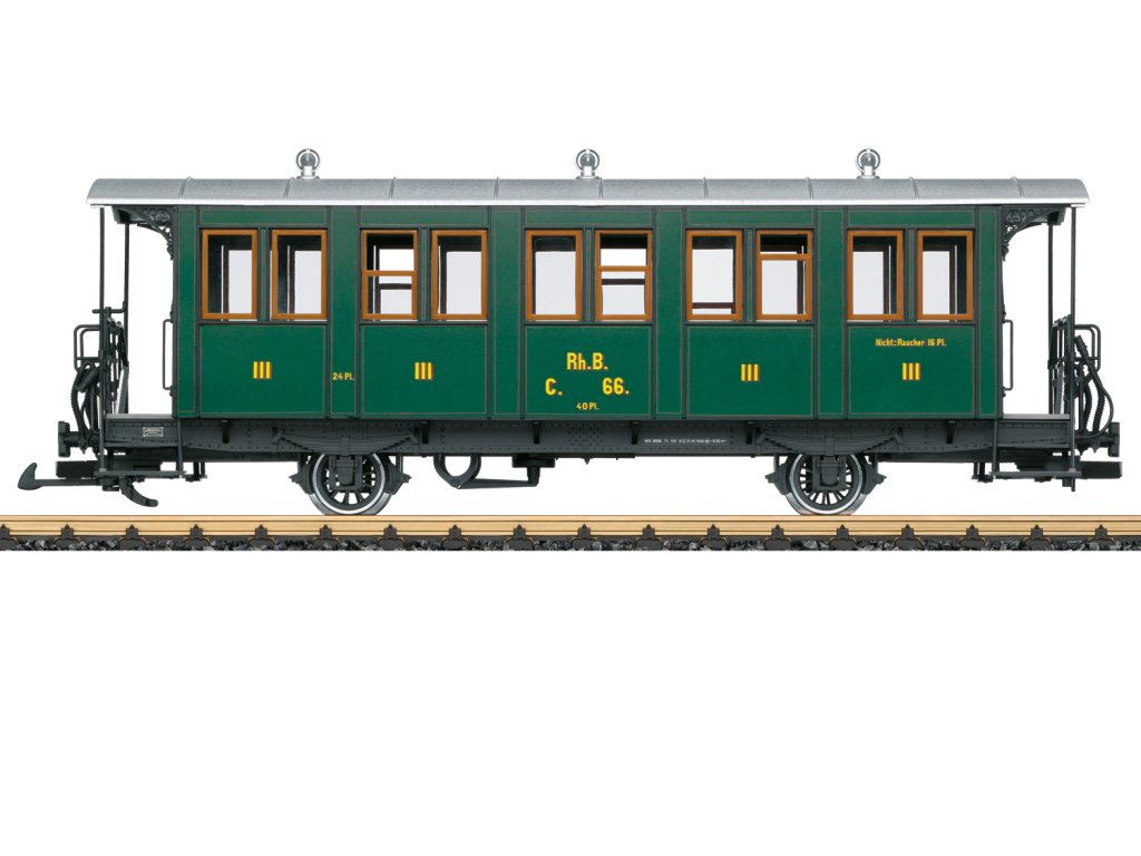 Model osobního vozu 3. třídy RhB (Rhétské dráhy). V zeleném livreji, jaký RhB dnes používá jako muzejní vůz. Autentické barevné schéma a nápisy. Plně detailní interiér, včetně tabulek s cílovými stanicemi vlaků. Kovová paprsková dvojkolí. Délka přes nárazníky 45 cm.