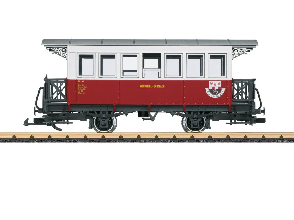 Osobní vůz č. 116, patřící obci Dörzbach, dráhy Jagsttalbahn. Vůz v červenobílém livreji, jak jezdil po Jagsttalbahn v 80. letech 20. století. Replika erbu obce Dörzbach. Kovová dvojkolí.