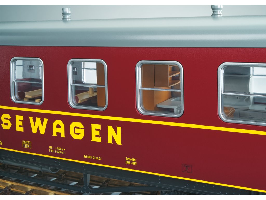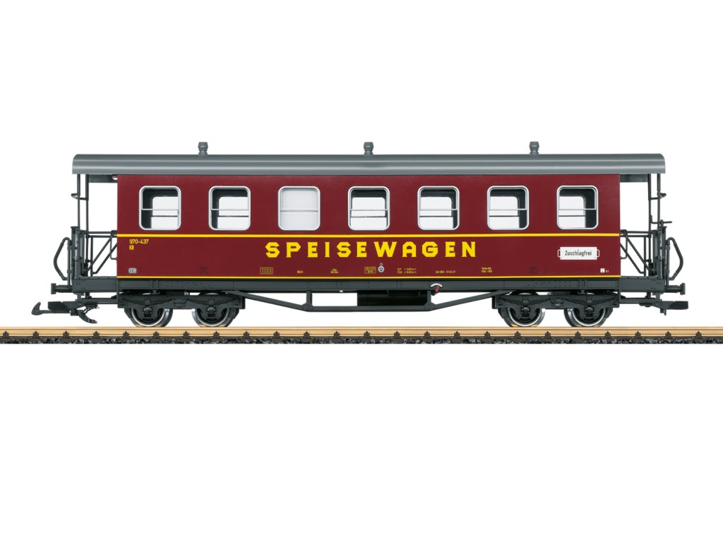 Model jídelního vozu SOEG (Sasko-hornolužická železnice). Současný livrej a nápisy z VI. éry. Otevíratelné dveře nástupiště, kompletní vnitřní vybavení přizpůsobené jídelnímu vozu. Kovová dvojkolí. Délka přes nárazníky 58 cm.