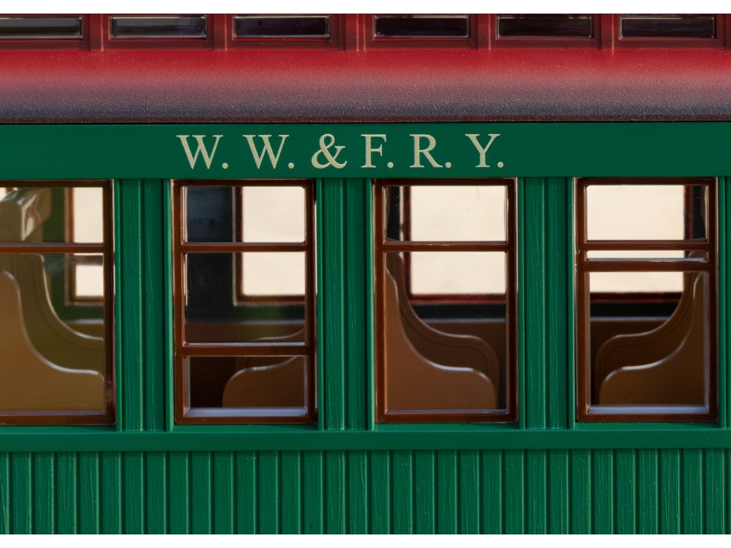 Model typického amerického historického osobního vozu v barvách železnice Wiscasset Waterville & Farmington, jak se dodnes používá na této historické železnici ve východních Spojených státech. Model je autenticky natřený a opatřen písmeny. Otevírací dveře, kompletní interiér. Kovová dvojkolí. Délka 49 cm.