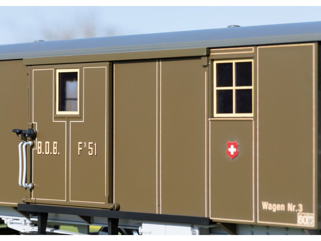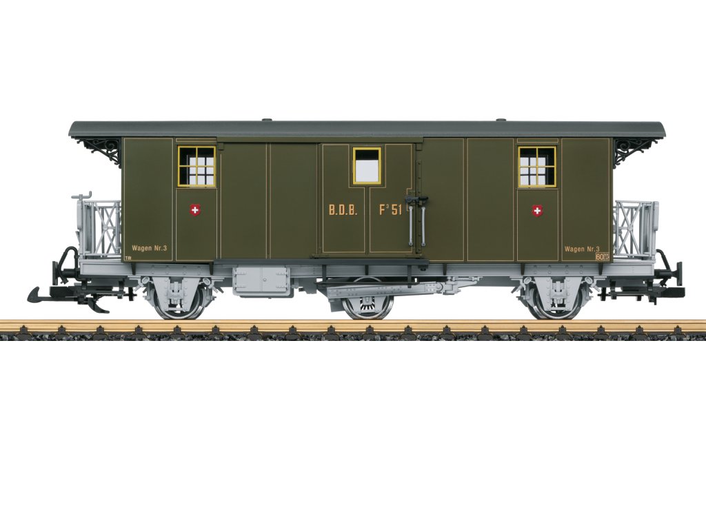 Model zavazadlového vagónu parní dráhy Brünig (BDB). Autentické barevné schéma a nápisy z VI. éry. Plně detailní interiér. Otevírací dveře na koncích a posuvné boční dveře. Kovová paprsková kola. Délka přes nárazníky 45 cm.