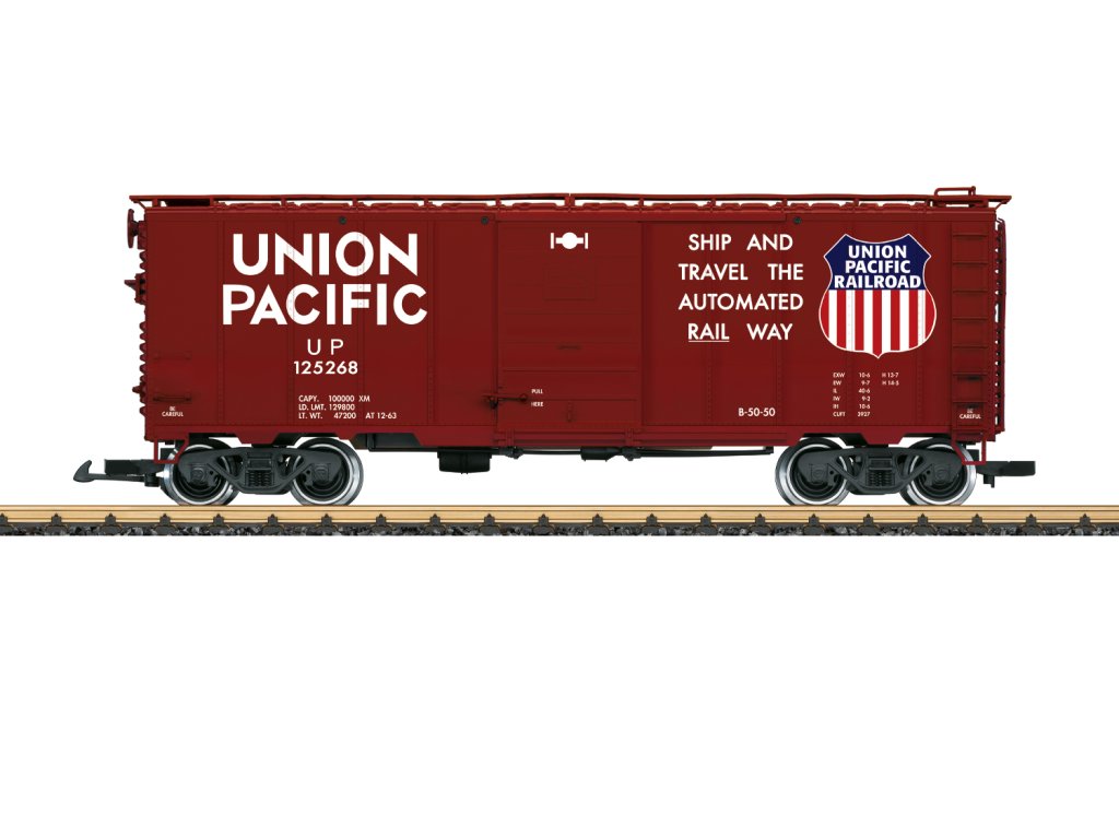 Model krytého nákladního vagonu Union Pacific. Hnědý livrej a nápis z éry III. Mnoho samostatně aplikovaných detailů, otevírací posuvné boční dveře. Kovová dvojkolí. Délka přes spřáhla 46 cm.