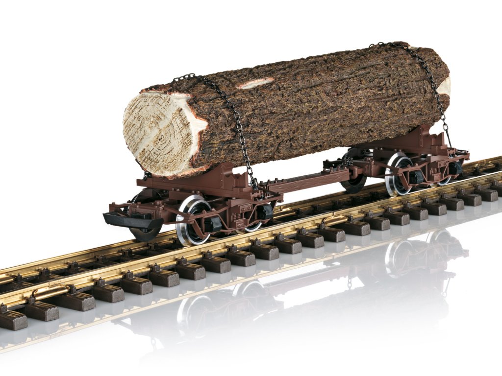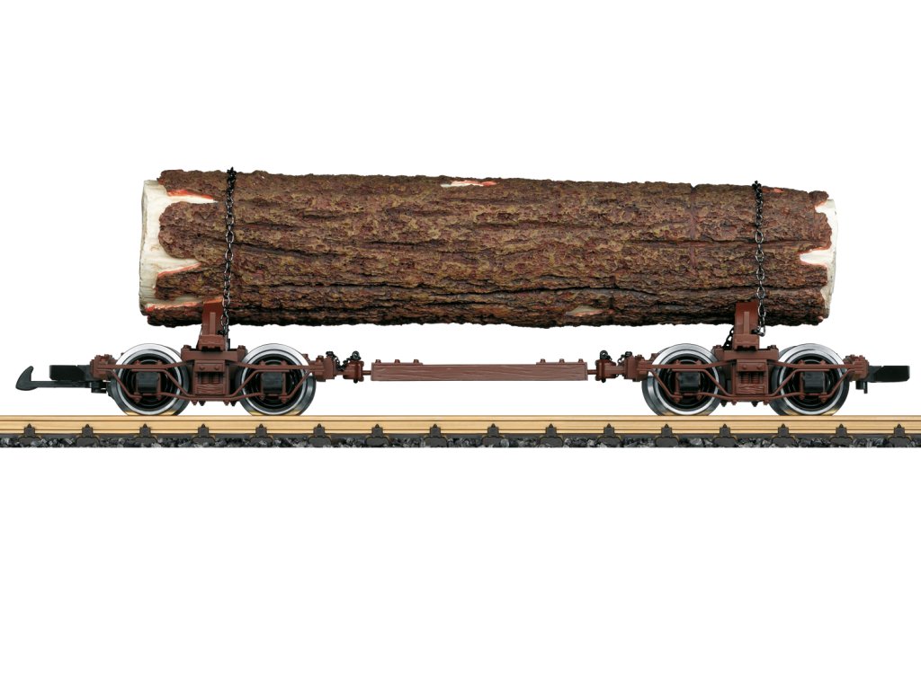 Model vozu na přepravu dřeva. Kovová kotoučová dvojkolí. Naloženo kmenem a zajištěno řetězy. Kovová kotoučová dvojkolí.