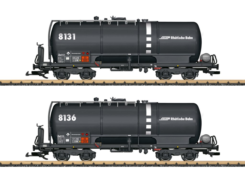 Sada cisternových vagonů řady RhB Za. Autentické barevné schéma a nápisy z éry VI. Čísla silnic Za 8131 a Za 8136. Cisternu lze plnit a vyprazdňovat. Kovová dvojkolí. Délka přes nárazníky na vůz 48 cm.