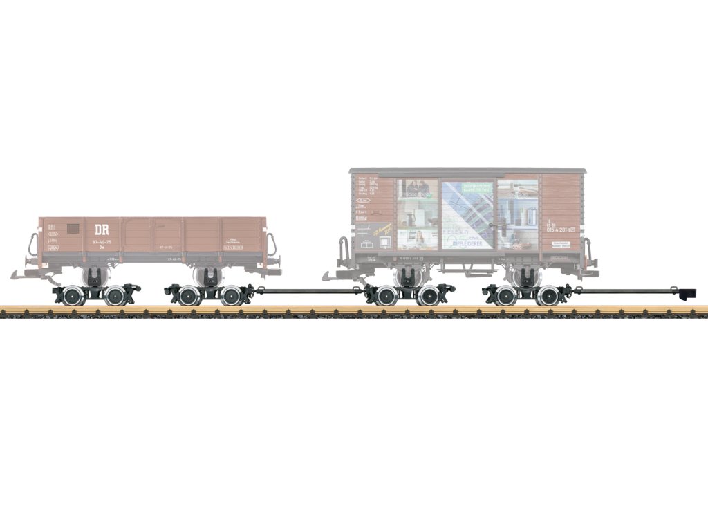 Sada sestávající ze čtyř transportních vagónů, jaké se používají na mnoha úzkorozchodných železnicích a některé z nich se používají dodnes. Zcela nový design. Na každý transportní vůz lze naložit dva dvounápravové vagóny; lze naložit jak vagóny s rozchodem 64 mm, tak i standardní vagóny LGB. Transportní vagóny a vagóny na ně naložené jsou spojeny navzájem a s lokomotivou nebo s vagónem se standardním spojem LGB, věrným prototypu, pomocí přiložených spojovacích tyčí. Kovová dvojkolí. Délka jednoho transportního vagónu: 10 cm.