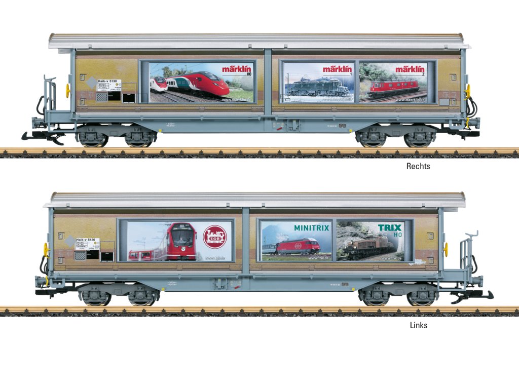 Model čtyřnápravového vozu s posuvnou stěnou Rhétské dráhy (RhB). Věrné originální barevné schéma a nápisy z VI. éry s reklamou značky Märklin. Posuvné dveře se věrně otevírají a zavírají. Kovová kotoučová kola. Délka přes nárazníky 62 cm.