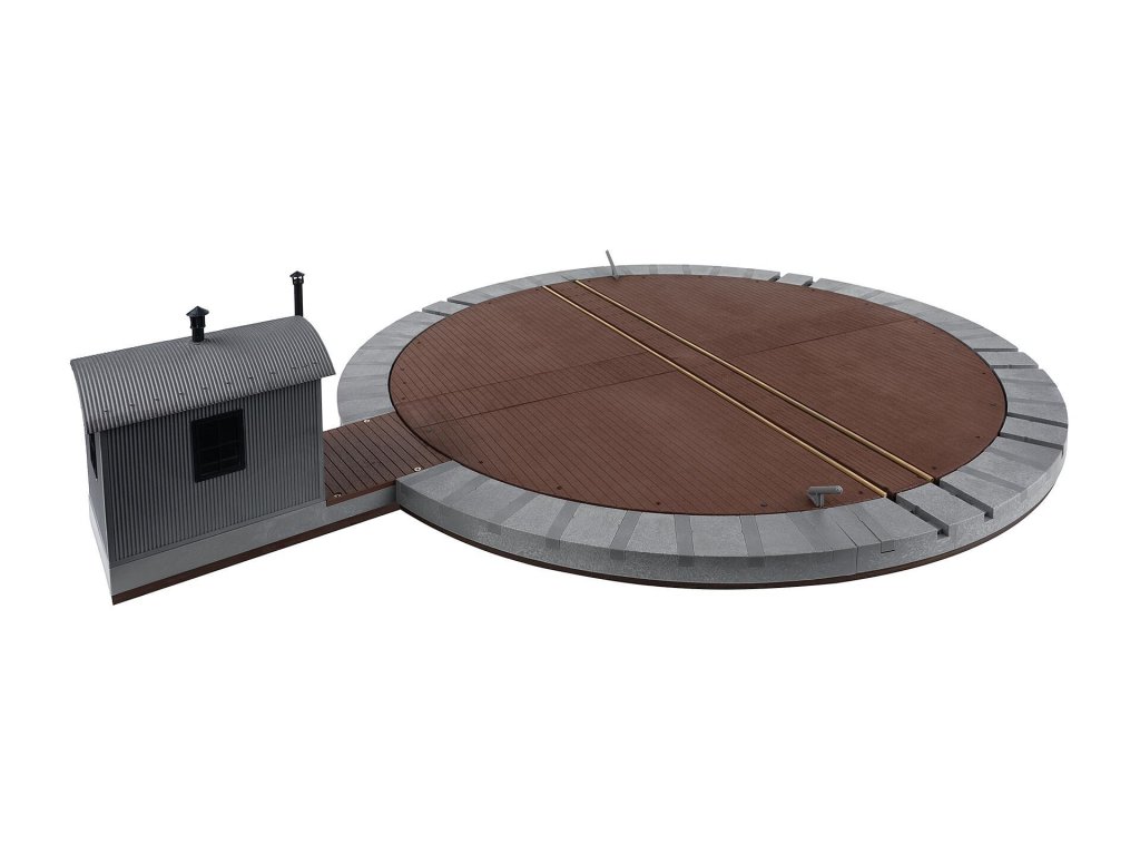 Odolná úzkorozchodná točna s kuličkovými ložisky, odolná vůči povětrnostním vlivům, zaujme svou nejvyšší přesností a dlouhou životností. Zvláštním lákadlem je nový dekodér, který je vhodný pro analogový i digitální provoz. Integrovaný modul reverzní smyčky zajišťuje plynulý a spolehlivý provoz. Točna je poháněna robustním 12V stejnosměrným převodovým motorem, který je součástí sady. Otáčení vpřed a vzad lze volně ovládat. Součástí je také odpovídající ochranná kabina, která stylově zakrývá pohon.