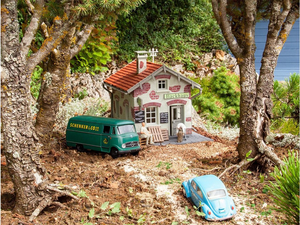 Rustikální pekárna s omítnutou fasádou s kamenným efektem, posuvnými dveřmi a špaletovými okny a červenou sedlovou střechou s taškami. Součástí stavebnice je základní deska a reklamní cedule.
