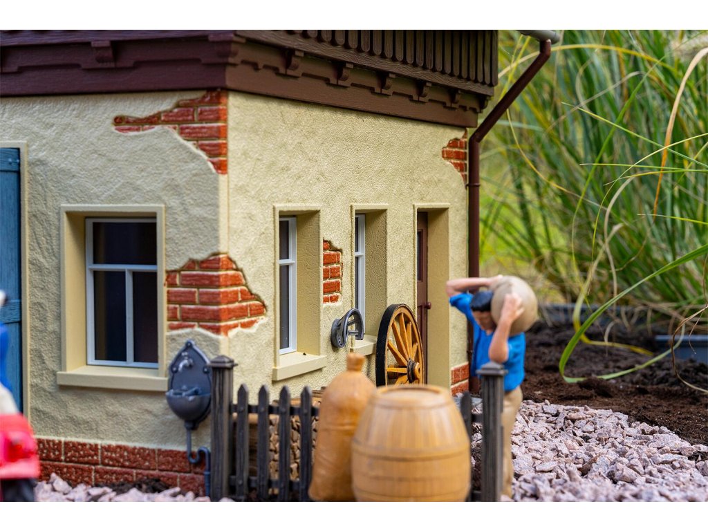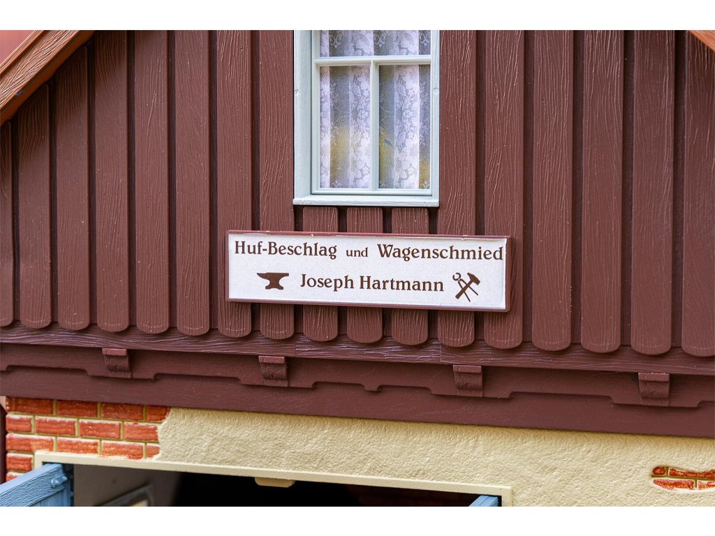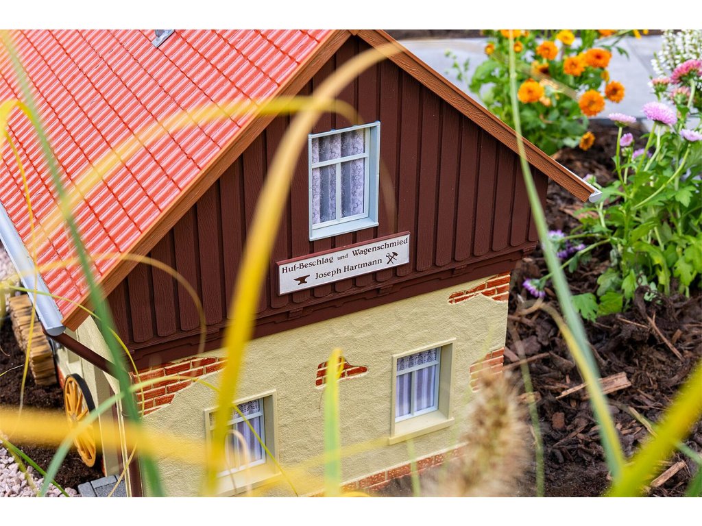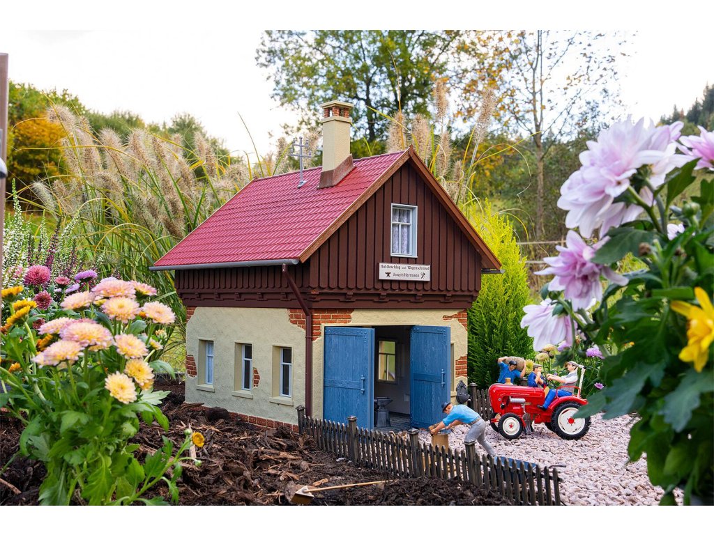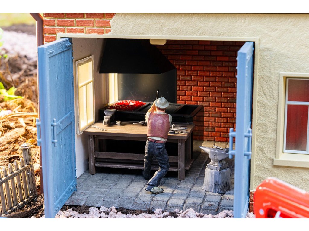 Zde se stále pracuje ručně! S tímto detailním modelem historické vesnické kovářské dílny si můžete do své zahradní železnice vnést tradiční řemeslné zpracování minulých dob. Kovárna zaujme svým masivním zdivem v přízemí v kombinaci s dřevěným štítem a klasickou šikmou střechou s červenými taškami, což kovárně dodává jedinečné kouzlo. Velké modré dvoukřídlé dveře nabízejí pohled do propracovaně zařízené dílny. Kovárna je plně vybavena ohništěm, kovadlinou, řadou nástrojů, pracovním stolem, vozovým kolem a různými dřevěnými komponenty.
