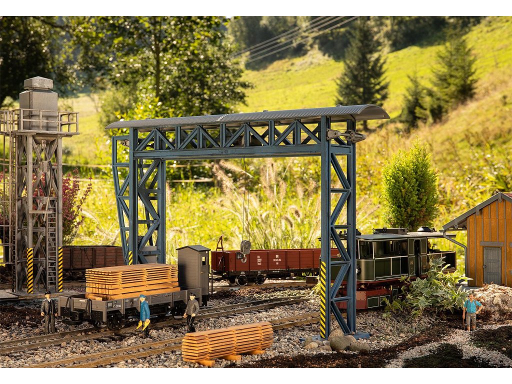 Těžký náklad! Tento typický železniční model je obvykle součástí železniční stanice. Lze jej však použít i všude, kde je třeba něco zvednout a naložit. Portálový jeřáb se rozprostírá přes dvě koleje.