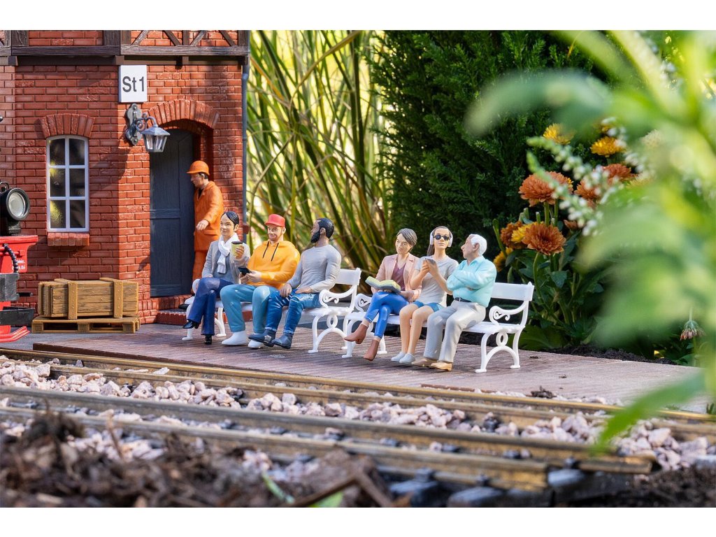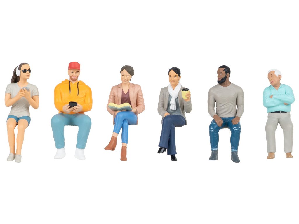 Čekání, cestování, přestávka! Šest cestujících v uvolněných pozicích – připraveni na další cestu nebo jen na krátký odpočinek. Muž si krátí čas se svým chytrým telefonem, žena si vychutnává kávu, zatímco jiná je pohroužena do knihy. Mladý muž se pozorně rozhlíží a žena se sluchátky na uších je zcela pohlcena hudbou. Starší pán už usnul – možná si před další zastávkou krátce zdřímne. Ideální pro vytváření realistických scén na autobusových zastávkách, v čekárnách nebo ve vozidlech!