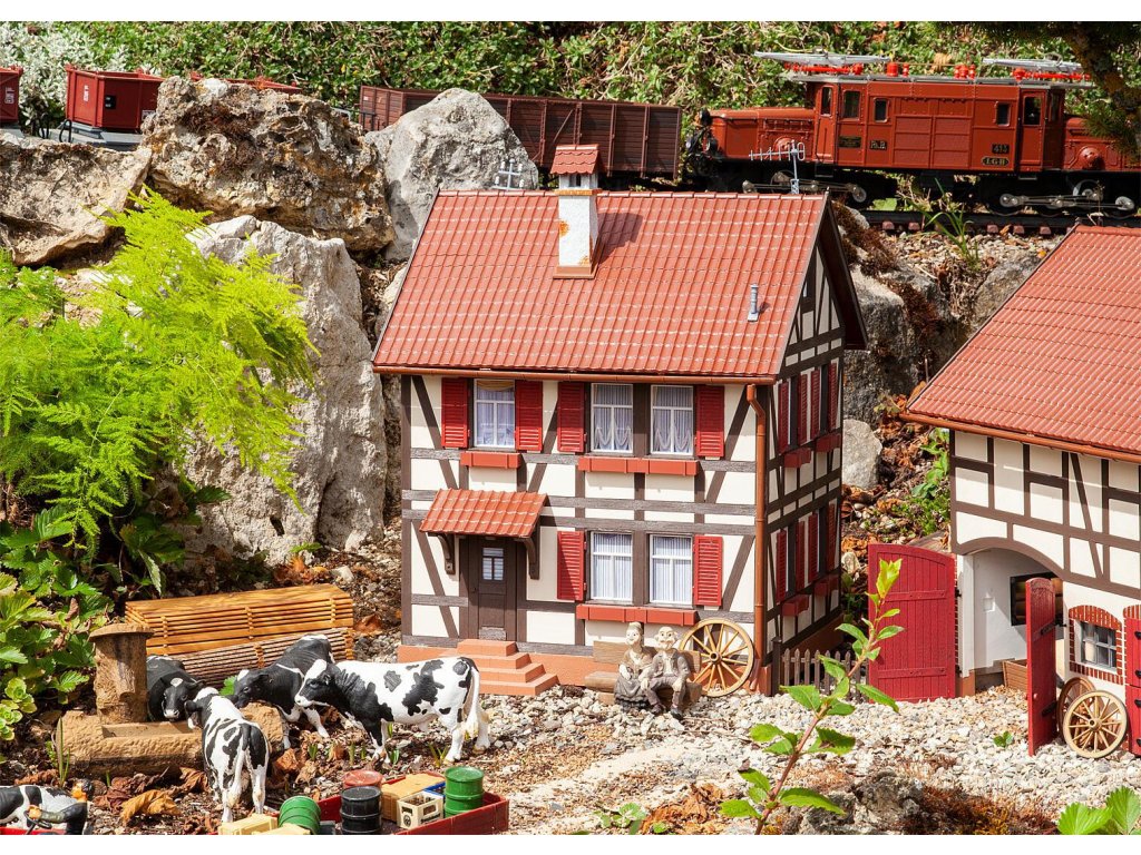 Dvoupatrový hrázděný dům s krytým vchodem, květináči, okenicemi a taškovou střechou s komínem. Hodí se k modelu „Stáj“, číslo položky 331727.