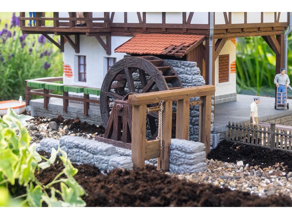 Vodní kolo s cihlovým kanálem představuje tradiční mlýnskou technologii v pečlivých detailech. Jemně texturovaný dřevěný vzhled a realisticky navržené kamenné zdi se dokonale hodí do venkovského prostředí – ideální pro mlýny, dílny nebo historická místa. Vodní kolo lze pohánět hobby motorem (číslo položky 330090, není součástí dodávky), čímž se promění v živý prvek vaší modelové krajiny.